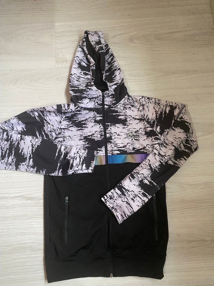 Kapüşonlu ve fermuarlı cepleri olan, sentetik kumaştan yapılmış, koyu renkli batik desenli ve renkli şerit detaylı dar kesim erkek çocuk ceketi. S beden