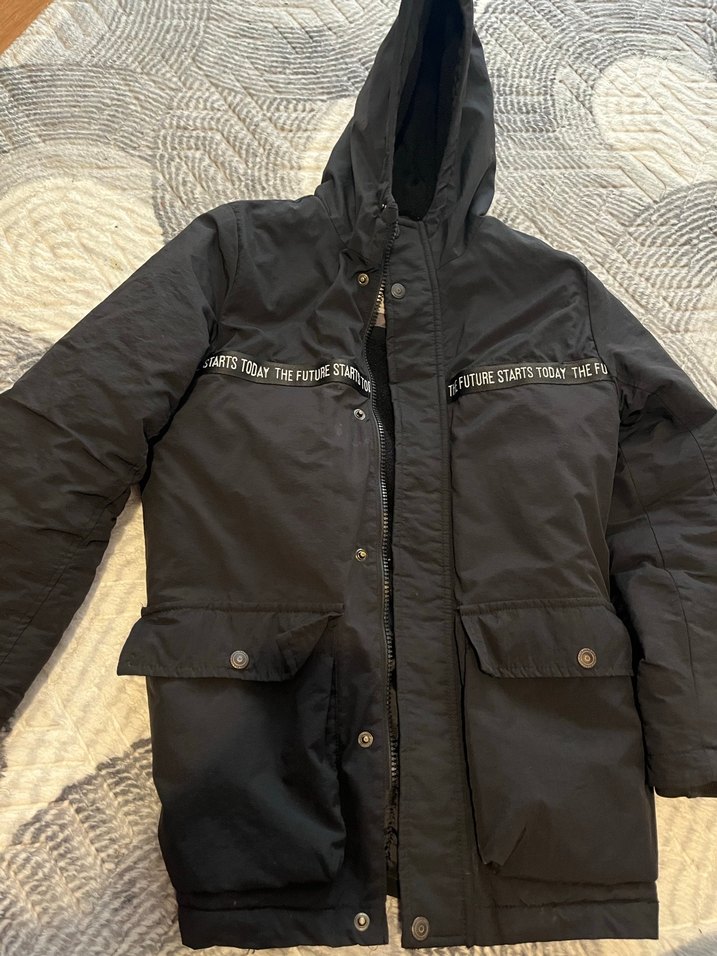 Kapüşonlu, baskılı detaylı erkek çocuk kabanı. Suni kumaştan, kürklü ve ince kesim. Siyah renkte 9-10 yaş