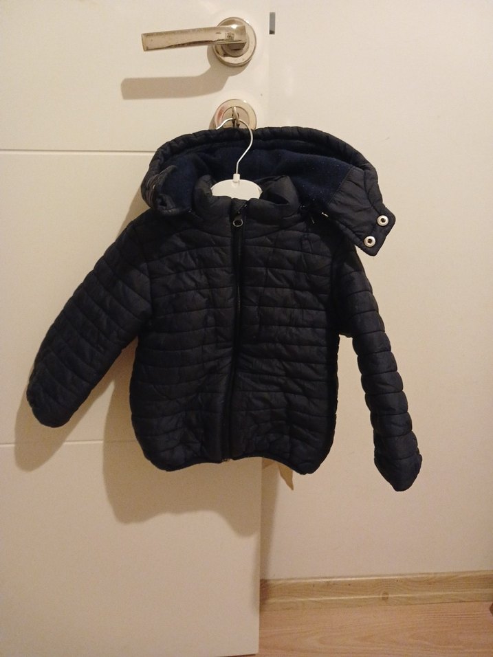 Siyah, kapüşonlu ve düğmeli detaylara sahip, erkek çocuklar için uygun, yumuşak ve sıcak tutan kumaştan yapılmış dar kesim mont.