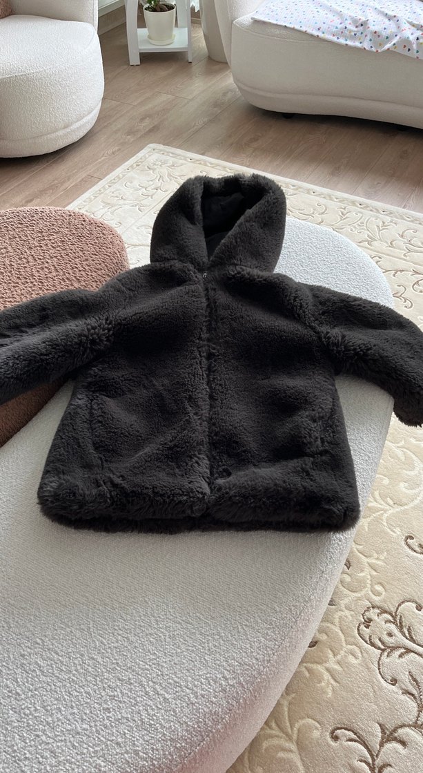 Kapüşonlu, bol kesim erkek çocuk montu, yumuşak ve sıcak peluş kumaştan, kürklü detaylı, desensiz ve siyah renktedir.