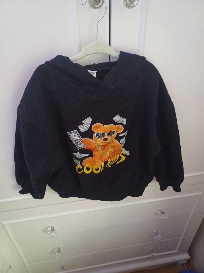 Kapüşonlu ve bol kesim siyah erkek çocuk sweatshirtü. Uzun kollu, ayı ve para baskılı. Yumuşak, sıcak kumaş ve örme detaylarıyla rahat sokak stili için uygun. Çocuk kapşonlu ayı baskılı sweatshirt 5-6 yaşa uyumludur kullanılmıştır fakat kullanıma engel bir deformesi yoktur.
