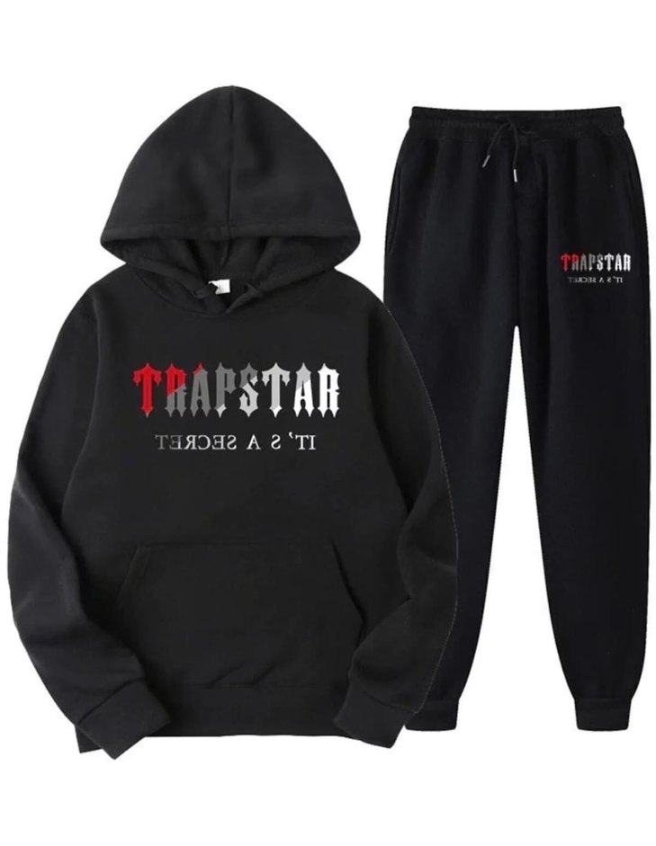 Yumuşak fleece kumaştan, kapüşonlu siyah sweatshirt ve baskılı TRAPSTAR logolu eşofman altı. Regular fit, rahat sokak stiliyle uyumlu.
