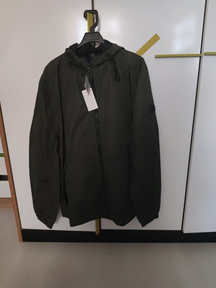 Kapüşonlu ve fermuarlı haki erkek ceketi, yağmurluk tarzı kumaştan, normal kesim ve uzun kollu, gündelik dış mekan kullanımı için uygundur.