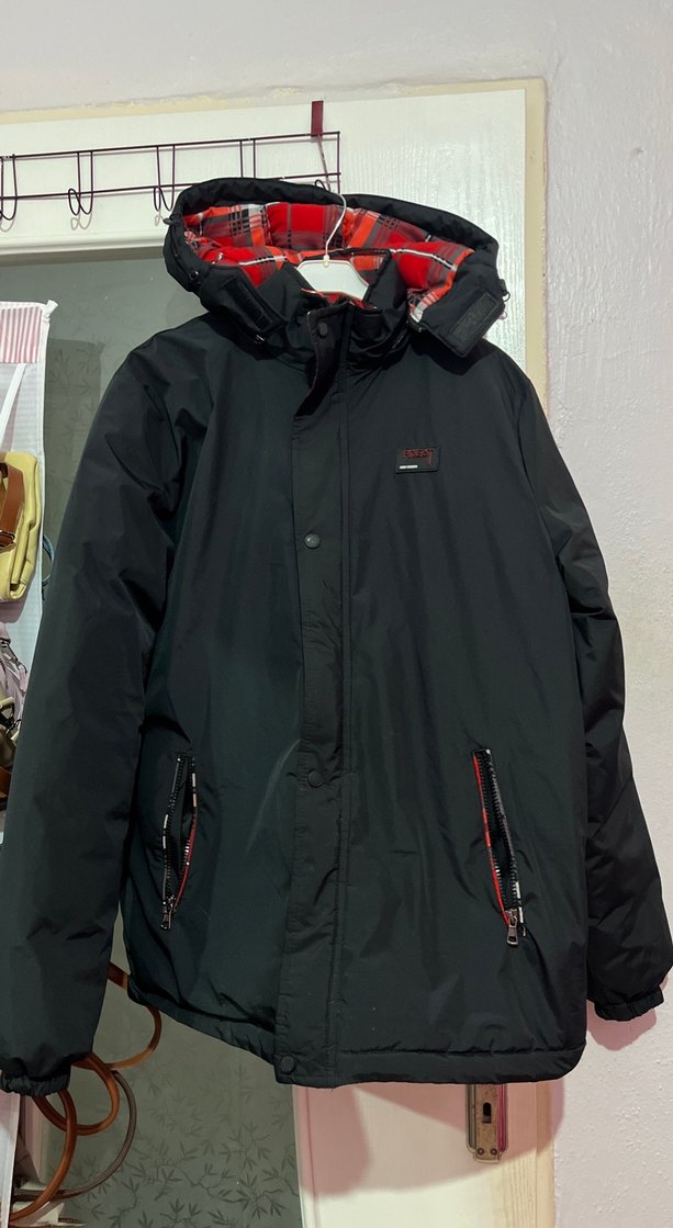 Bu siyah erkek mont, kesik yaka ve uzun kolludur. Fermuarlı cepleri ve kapüşon içindeki kırmızı kareli desenli astarı ile dış mekan kullanımı için uygundur.
