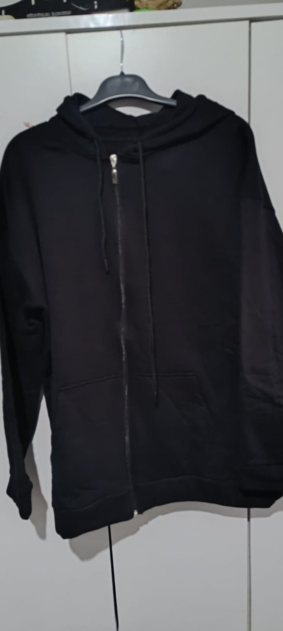 Siyah kapüşonlu ceket, fermuarlı, uzun kollu ve bol kesimdir. Midi boyda, yumuşak ve sıcak kumaştan üretilmiştir, günlük rahat stil için uygundur. bedenleri mevcuttur