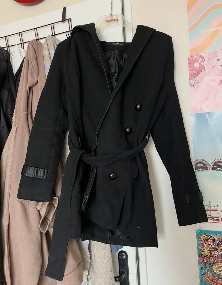 Kapüşonlu, çift düğmeli siyah kaban. Belde kuşak ve manşetlerde detaylar bulunur, iç kısmı düzgün astarlıdır. Bir sorunu yok çok az giyildi