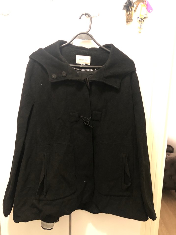 Kapüşonlu, ön cepli siyah kadın kaban. Yumuşak ve sıcak kumaştan üretilmiş, düğmeli ve çıtçıtlı kapama detayları bulunur. Kolları açık bir model , iç astar kısmı ve tek kol kısmında sökülme mevcut görsellerde mevcuttur