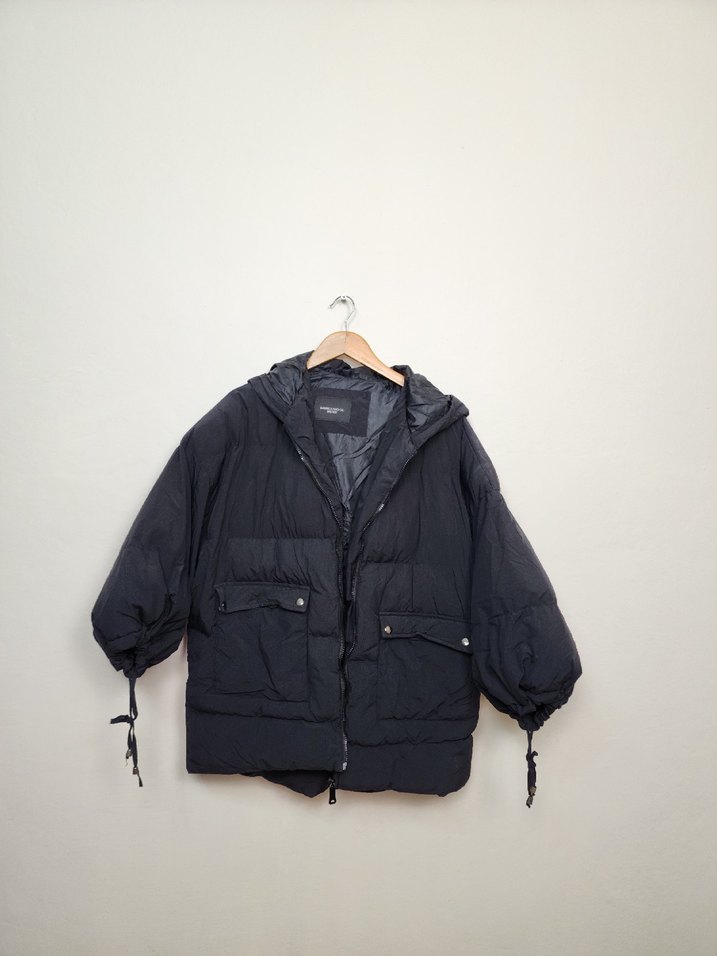 Siyah kadın kış montu, kapüşonlu ve bol kesimdir. Yumuşak ve sıcak kumaştan yapılmış, bel detaylı ve askılı kolludur. Normal midi boyda, rahat sokak stili için uygundur.