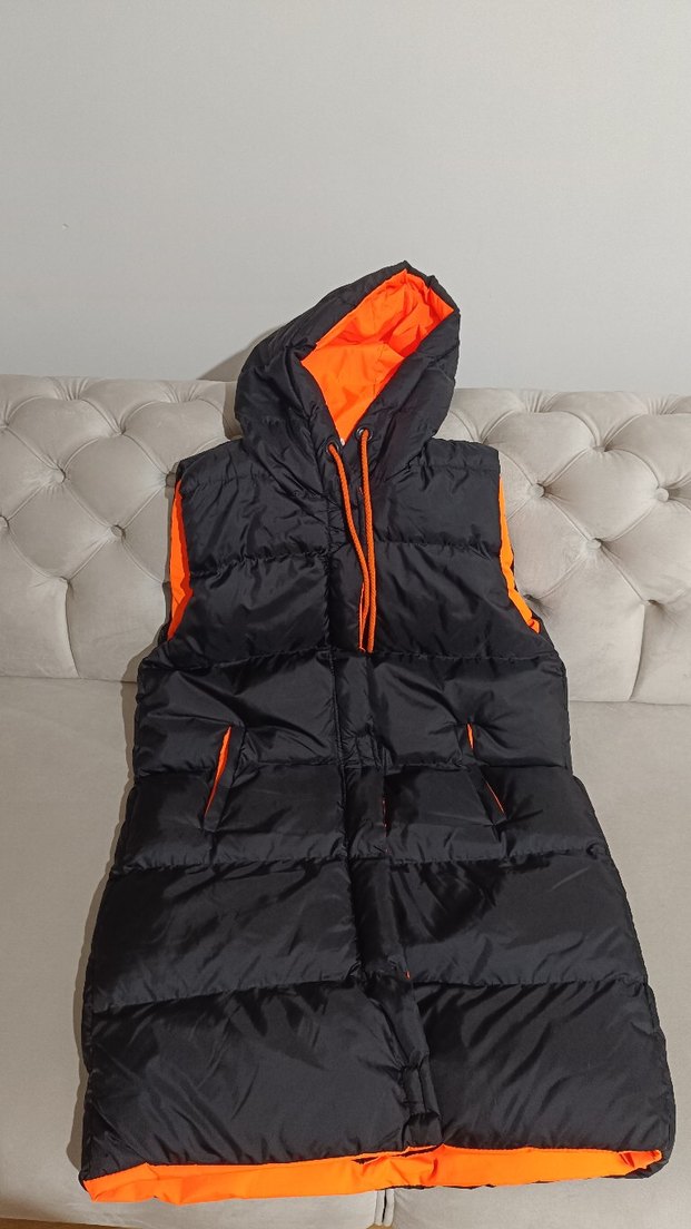 Yüksek yakalı, fermuarlı, kolsuz siyah şişme yelek. Parlak turuncu kapüşon astarı ve midi boy. Dış giyim. 38 beden.