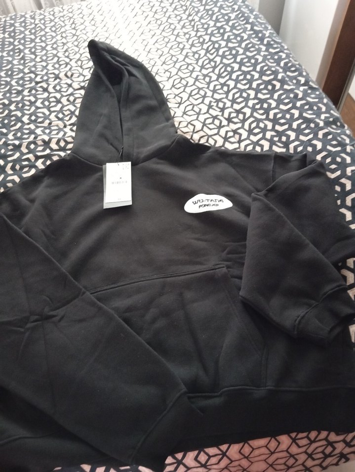 Siyah kadın sweatshirt, kapüşonlu ve uzun kolludur. Yumuşak fleece kumaştan üretilmiş, baskılı detay ve fermuar özelliği vardır. Normal boyda, rahat kesim ve sokak stili için uygundur.