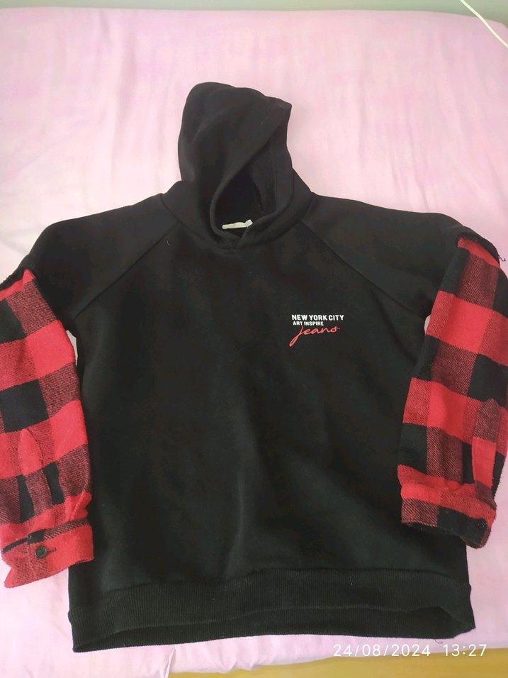 Bu siyah kapüşonlu sweatshirt, kırmızı ekose desenli uzun örgü kollara, bol kesime ve kısa boyuta sahiptir. Rahat sokak stili ve yumuşak, sıcak kumaş ile günlük kullanıma uygundur.
