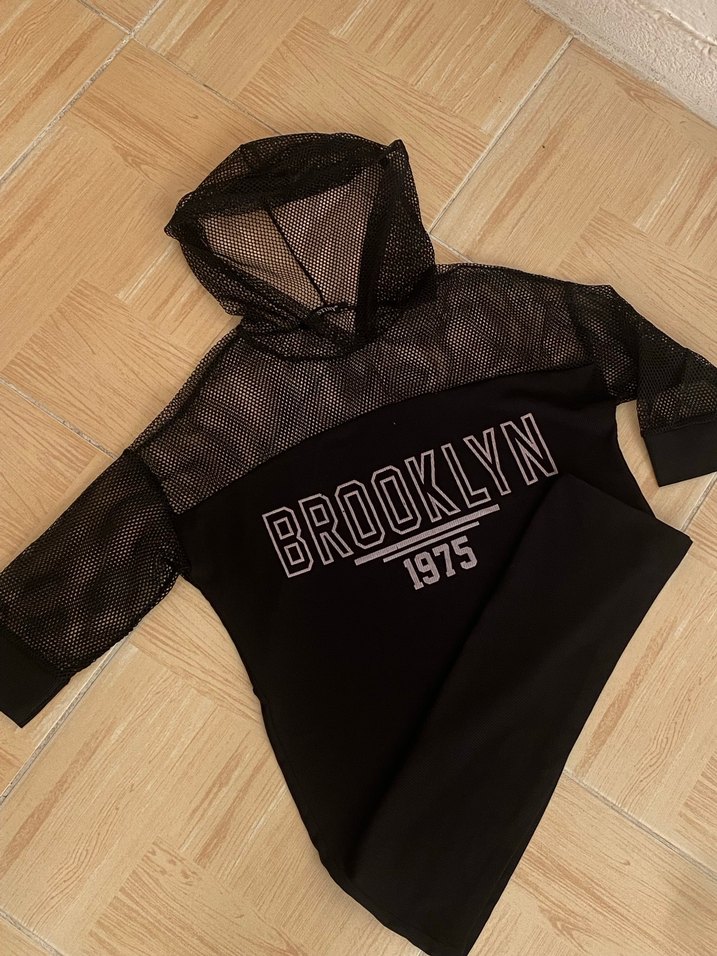 Uzun kollu, kapüşonlu ve bol kesim siyah sweatshirt, örgü file üst kısım ve 'BROOKLYN 1975' baskılı. Kısa, sokak tarzı, günlük kullanım için uygun.