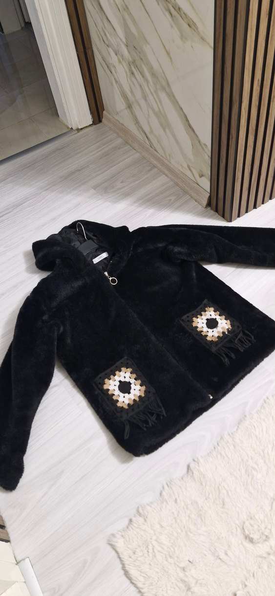 Kapüşonlu, uzun kollu siyah ceket, yumuşak peluş kumaş ve ceplerinde nakış detaylarına sahiptir. Salaş kesimdir ve günlük kullanıma uygundur.