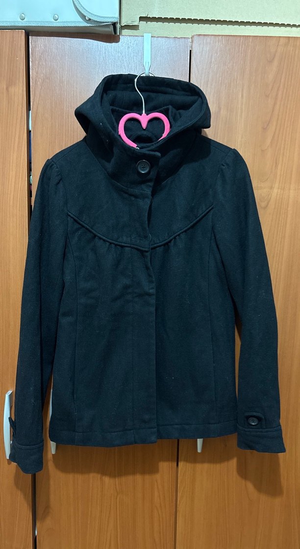 Kapüşonlu ve düğmeli siyah kaban, uzun kollu ve şık tasarıma sahiptir. Vücuda oturan kesimiyle sade bir görünüm sunar.