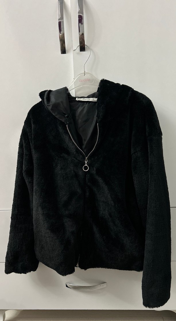 Siyah, kapüşonlu midi uzunlukta peluş mont. Yumuşak fleece kumaştan, bol kesim ve uzun kollu. Peluş detayları ile rahat ve şık sokak stili için uygun.