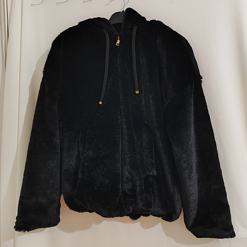 Siyah mini boy, kapüşonlu, uzun kollu ve bol kesim cekettir. Yumuşak peluş kumaştan yapılmış, kürk detaylarıyla sıcak tutar. Günlük kullanıma uygundur.