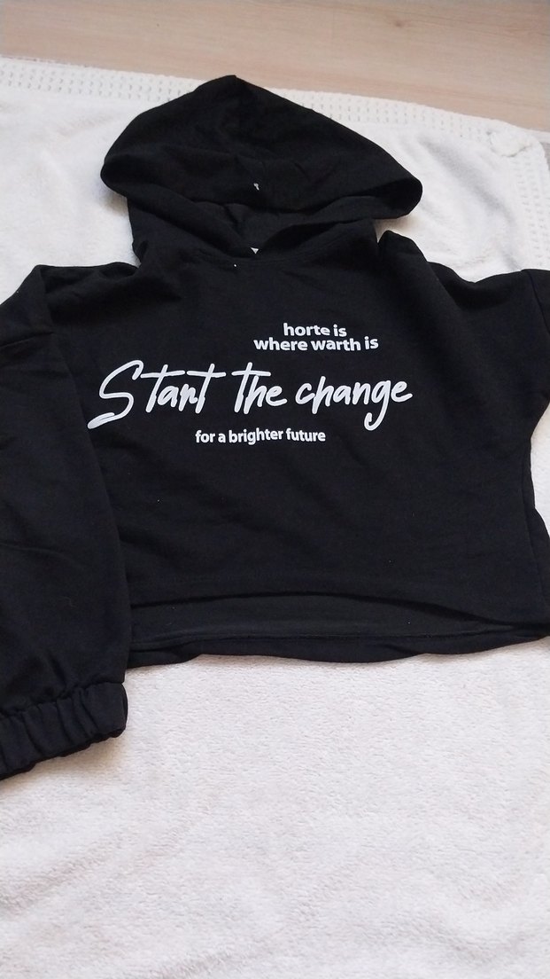 Uzun kollu, kapüşonlu ve baskılı sloganlı siyah bol kesim mini sweatshirt. Düğme detayları bulunur, trend bir görünüm sağlar. crop model