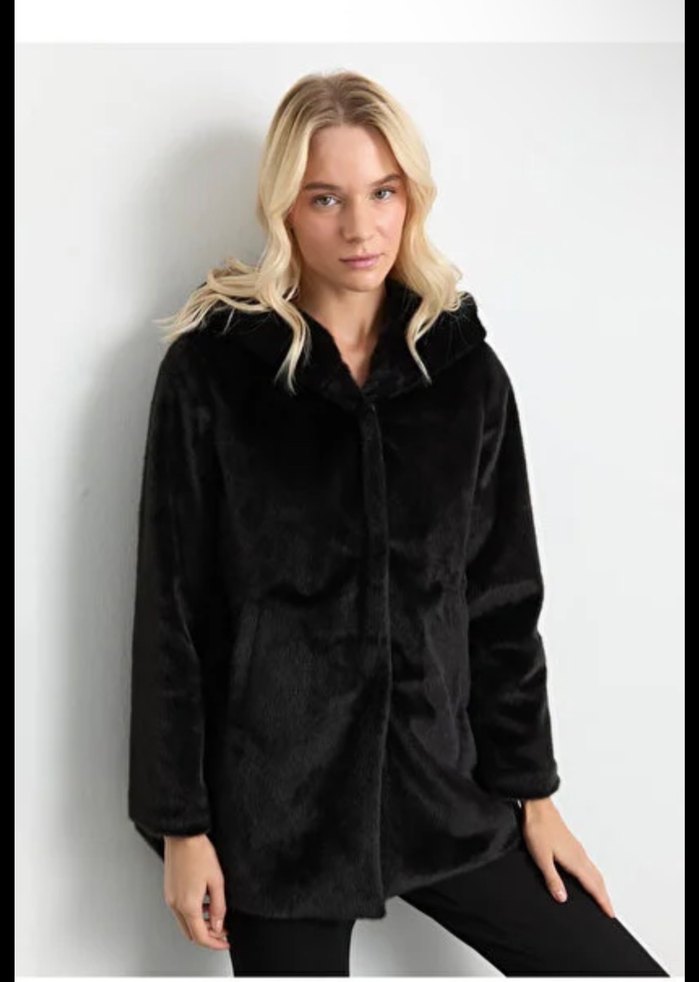 Bu siyah kapüşonlu mont, yumuşak peluş kumaş ve kürk detaylarına sahiptir. Bol kesim, uzun kollu ve midi boydadır, rahat sokak stili için uygundur.
