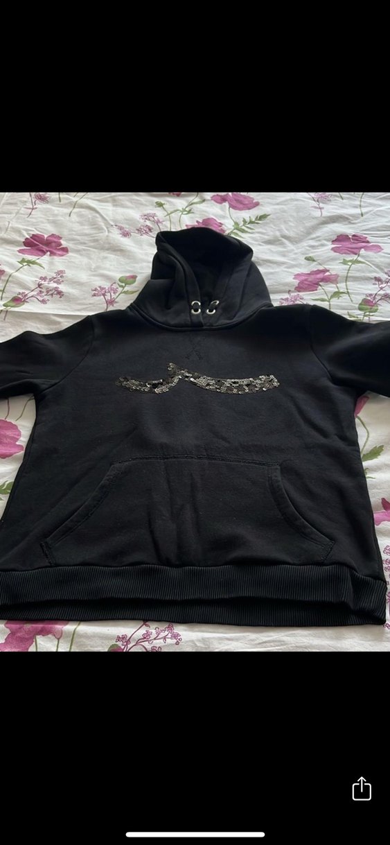 Siyah kapüşonlu, uzun kollu ve bol kesim sweatshirt. Parlak pullu yılan desen detaylarıyla günlük kullanıma uygun rahat bir model.