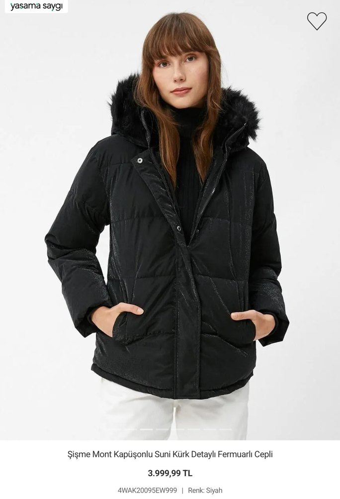 Siyah, normal uzunlukta şişme mont, kapüşonunda suni kürk detayları ve yakasında kesik yaka bulunur. Bol kesim, uzun kollu, fermuarlı ceplidir, sentetik kumaştan yapılmıştır.