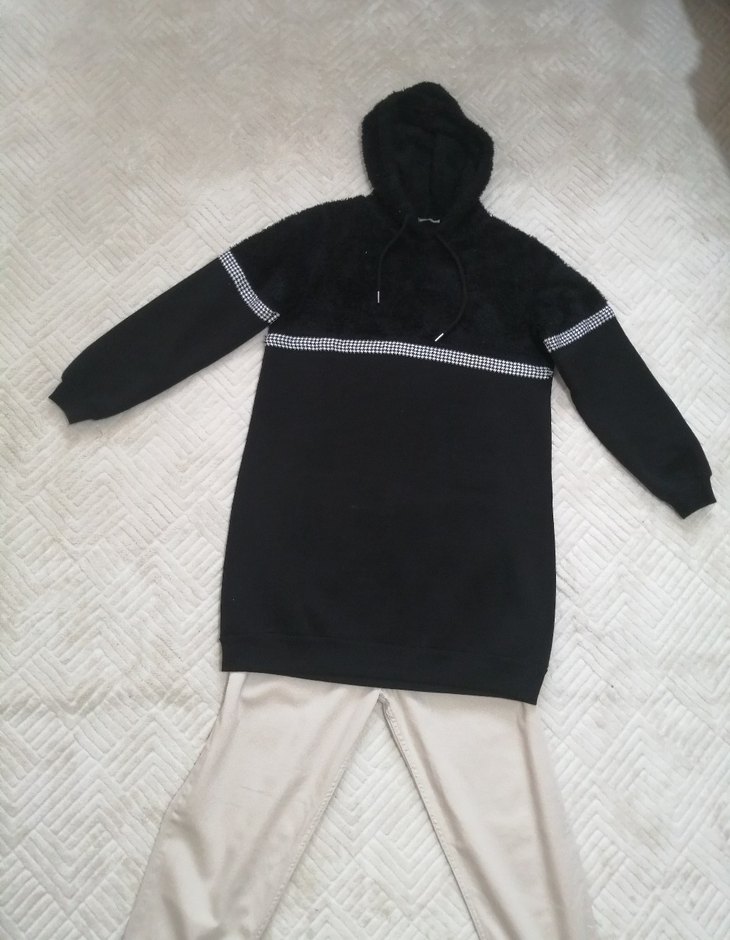 Siyah kadın üç iplik kumaş sweatshirt, kapüşonlu ve uzun kolludur. Bol kesim ve midi boydadır. Üst kısmı polar ve yumuşak, sıcak kumaşıyla rahat sokak stili için uygundur.
