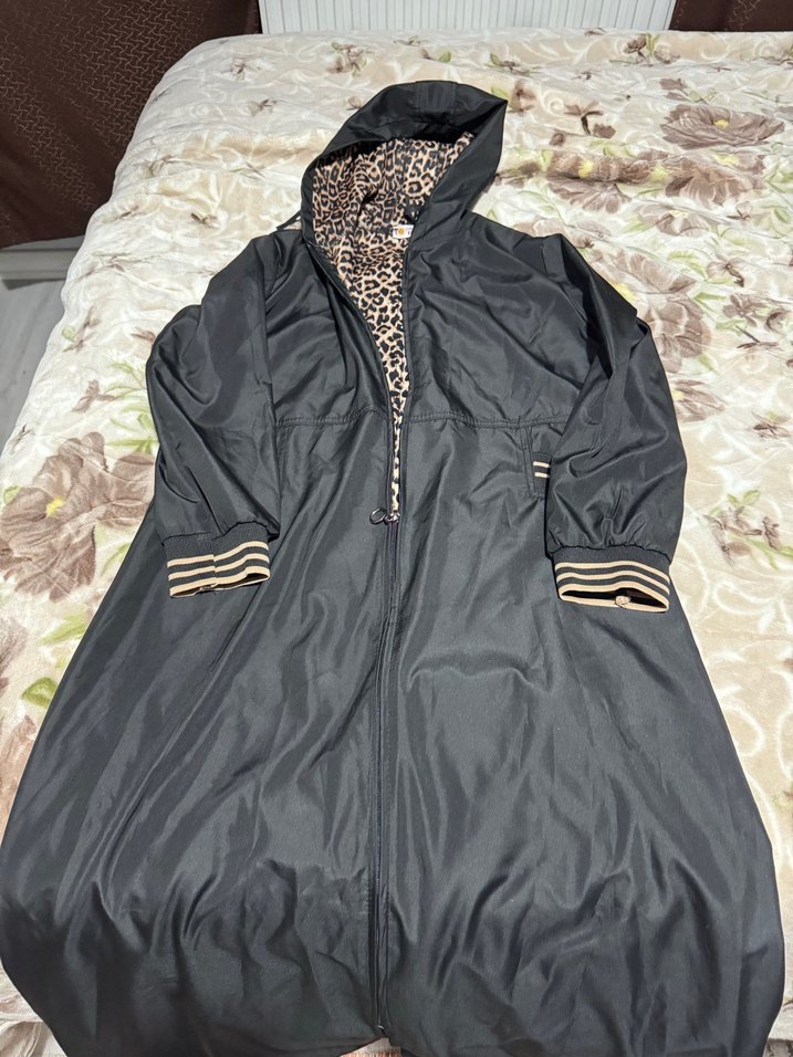 Kapüşonlu ve fermuarlı siyah uzun yağmurluk, rahat ve bol kesimlidir. Uzun kollu, çizgili manşetlere ve içi leopar desenli şık bir astara sahiptir. ️