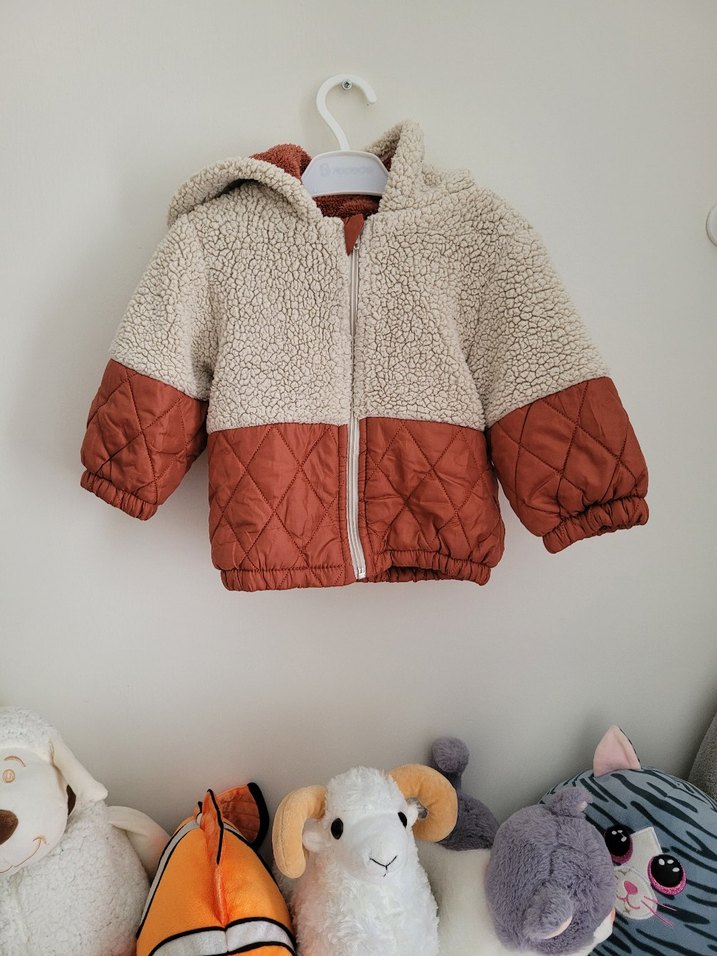 Kapüşonlu, suni kürklü üst kısmı ve kahverengi kapitone alt kısmı olan, sokak tarzı gri-kahverengi erkek çocuk ceketi. Fitted kesim.