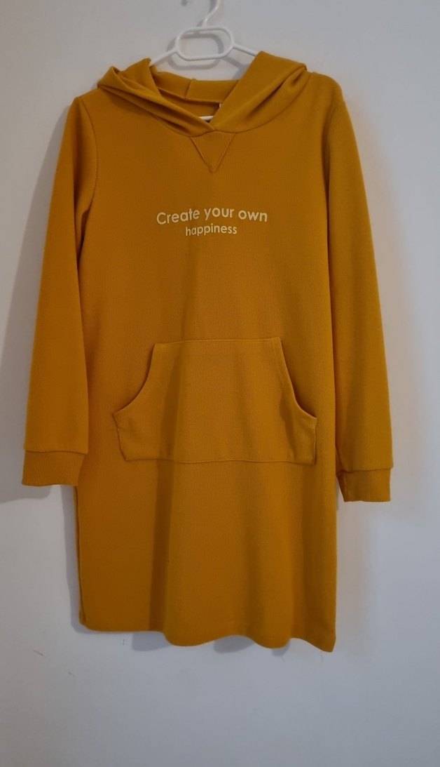 Defacto kapüşonlu sweat elbise, uzun kollu ve bol kesimdir. Önünde cepli ve "Create your own happiness" yazılı baskı vardır. Yumuşak, sıcak kumaştan üretilmiş, günlük rahat stil sunar. 10 /11 yaş için uygundur fotoğraflarda ölçüler detaylı olarak verilmiştir lütfen ölçüleri dikkate alınız. iade kabul etmiyorum. herhangi bir kusuru yoktur
