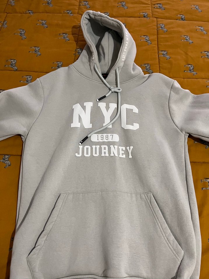 Gri renk, kapüşonlu ve uzun kollu, bol kesim sweatshirt. Önde fermuarlı cep ve NYC, 1987, JOURNEY baskıları bulunur. Yumuşak ve rahat kumaş.