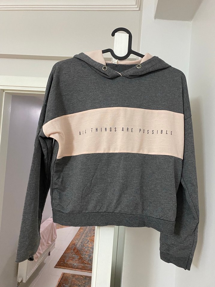 Gri renkli, kapüşonlu, baskılı sweatshirt. Uzun kollu, bol kesim ve normal boyda.