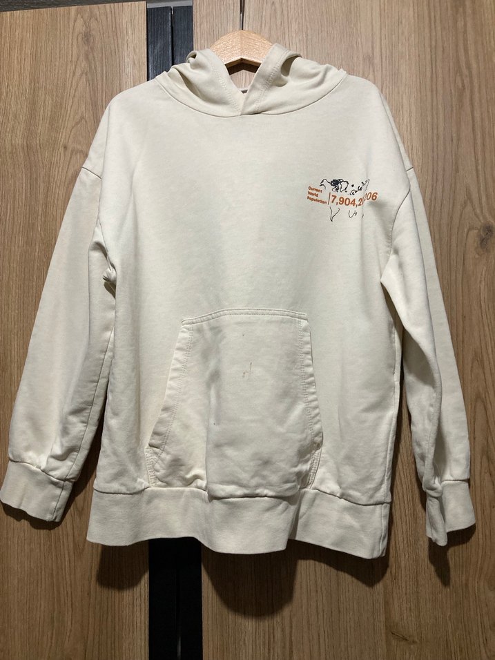 Beyaz, uzun kollu, kapüşonlu sweatshirtü, rahat kesim ve baskılı detaylarla. Yumuşak ve sıcak kumaştan, cep detaylı, günlük sokak stili için uygun. Leke var