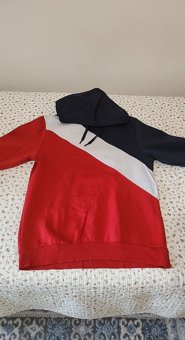 Beyaz kısmında ufak bir kaç leke var. Belli bile olmuyor o yüzden ucuza bırakıyorum. Kapüşonlu ve uzun kolludur. Koyu kırmızı, lacivert ve beyaz renk bloklarıyla tasarlanmıştır. Yumuşak ve sıcak kumaş, fermuarlı detay içerir. Trendy casual tarz için uygundur.