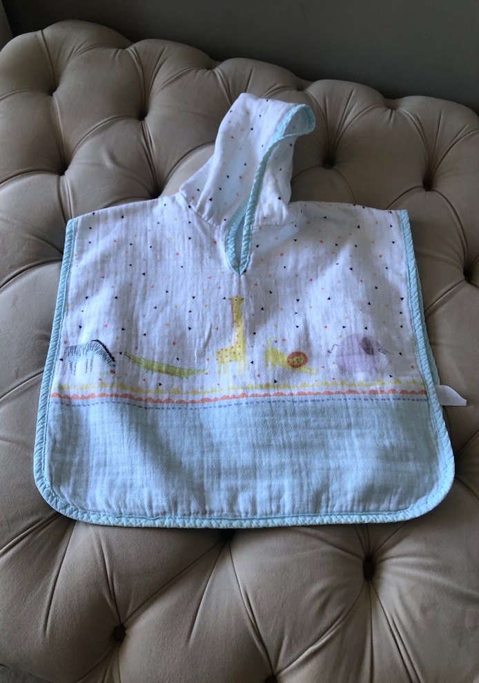 Pastel renklerde beyaz zeminli, kapüşonlu 0-2 yaş çocuk ve bebek kapuşonlu havlu panço. Az kullanıldı. Yumuşak dokulu ve açık mavi kenarlıklıdır.