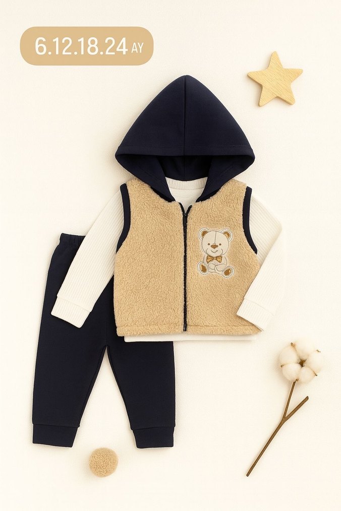 Nakışlı ayı figürlü triko yelek, uzun kollu bisiklet yaka üst ve koyu renk pantolon. Yumuşak ve sıcak kumaş. 6-24 ay arası bedenler. Ürünler kendi üretimimizdir toptan ve parakende satışımız mevcuttur toptan fiyat için yorumlara yazabilirsiniz