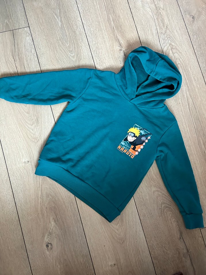 Turkuaz renkli, kapüşonlu ve uzun kollu erkek çocuk sweatshirtü. Yumuşak ve sıcak örme kumaştan, bol kesim ve renkli baskılı desenle sokak stili için uygundur.