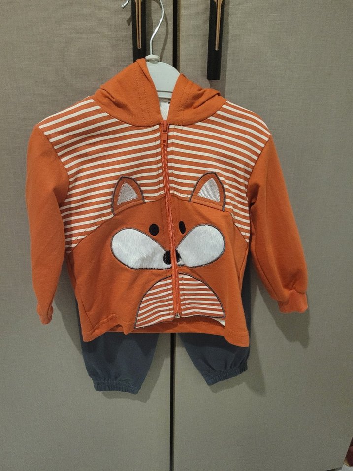 Turuncu ve beyaz çizgili, kapüşonlu ve uzun kollu, hayvan yüzü baskılı, fitted çocuk takımı. Hiç kullanılmadı. 86 beden