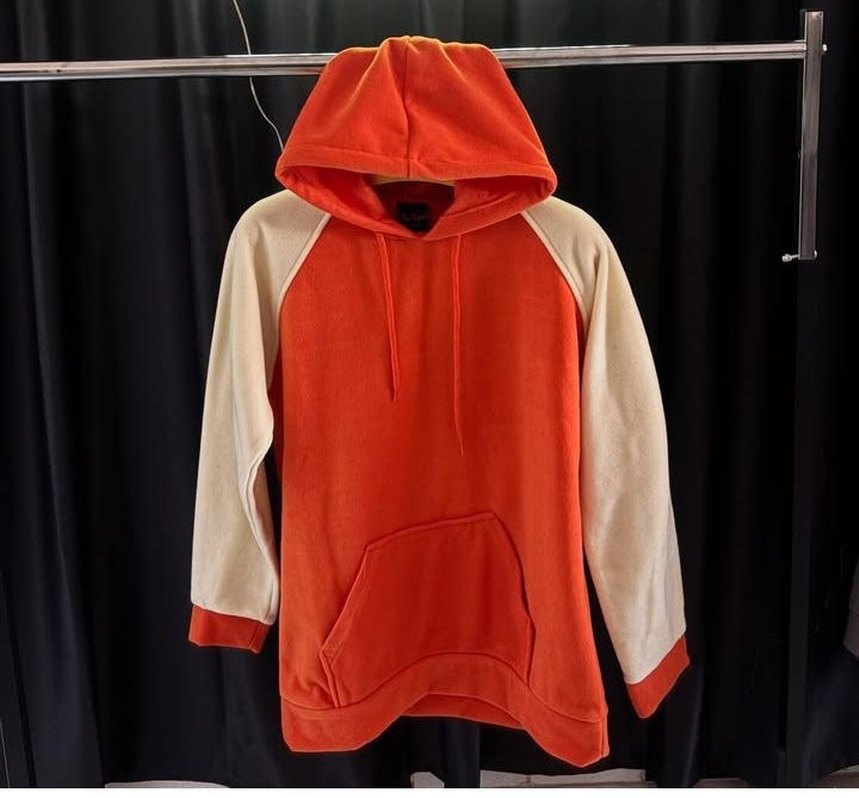 Kadınlar için kapüşonlu, uzun kollu ve bol kesim sweatshirt. Canlı turuncu gövde ve krem kollardan oluşan, yumuşak ve sıcak kumaştan yapılmış rahat sokak tarzı parça. Günlük kullanıma uygun şık ve rahat.