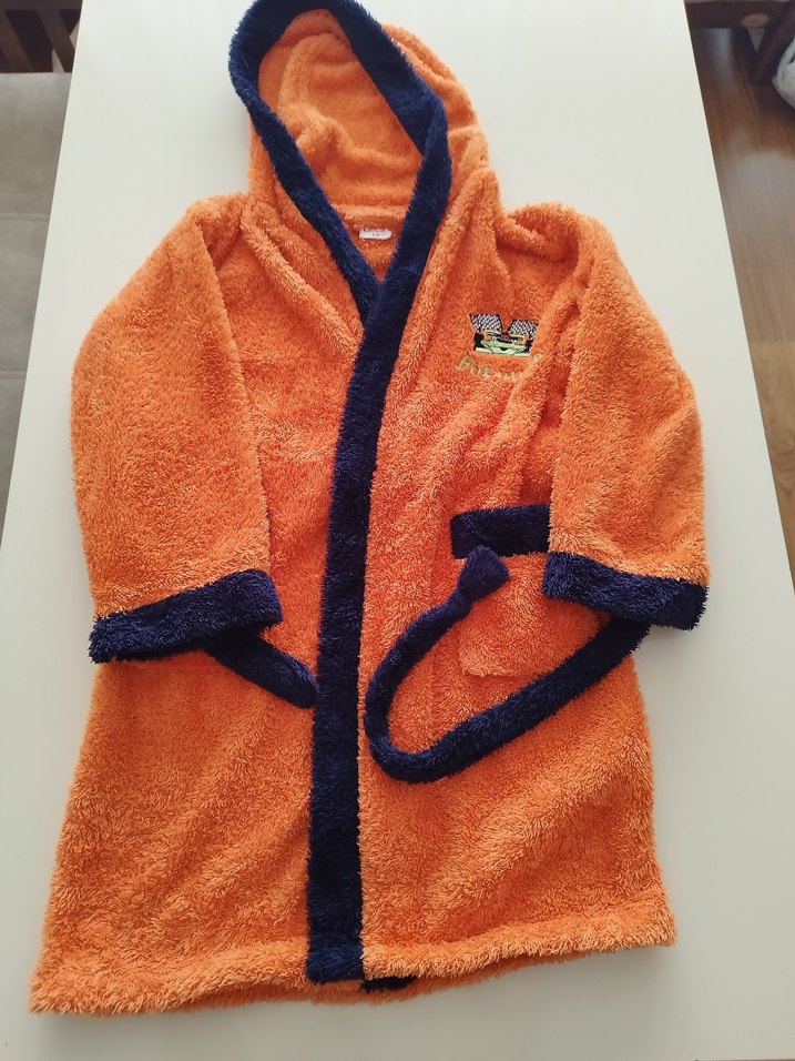 Yumuşak ve emici turuncu kumaştan, kapüşonlu ve kemerli erkek çocuk bornoz. Göğüste renkli nakış detayı bulunur.