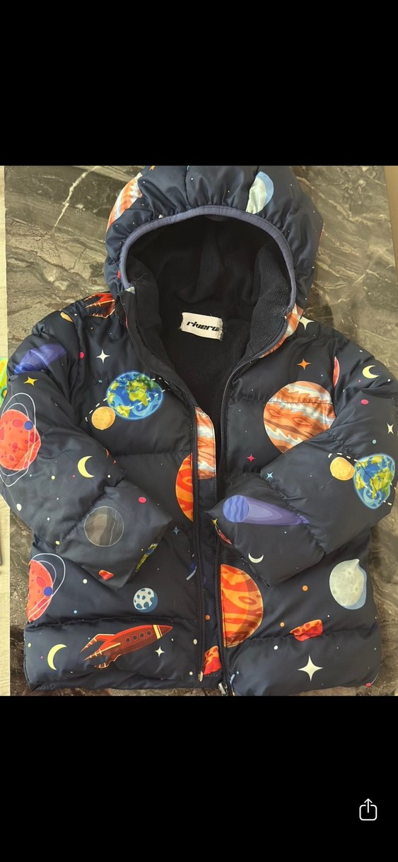 Kapüşonlu, düğmeli ve astarlı bu erkek çocuk montu, yumuşak ve sıcak kumaştan üretilmiştir. Koyu renkli çoklu uzay temalı baskıya sahiptir.