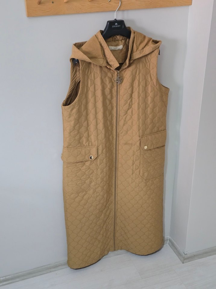 Kapüşonlu Uzun Bej Kadın Yelek