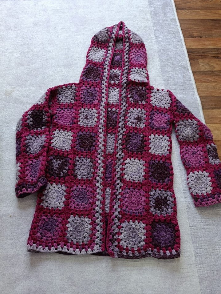 Kapüşonlu ve uzun kesime sahip bu bohem tarz kadın hırka, bordo ve gri tonlarında örgü örneklerle tasarlanmıştır. Rahat kesimi ve uzun kollarıyla günlük kullanıma uygundur. kuzenime air bedeni uymadığı satışta