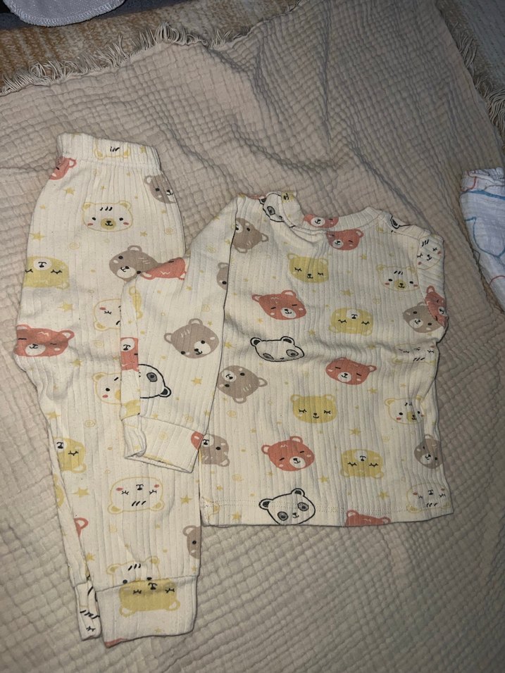 Kapüşonlu yakalı, uzun kollu, bol kesim erkek çocuk pijaması. Örgü kumaştan yapılmış, pastel tonlarda çok renkli ayı desenleri içerir.