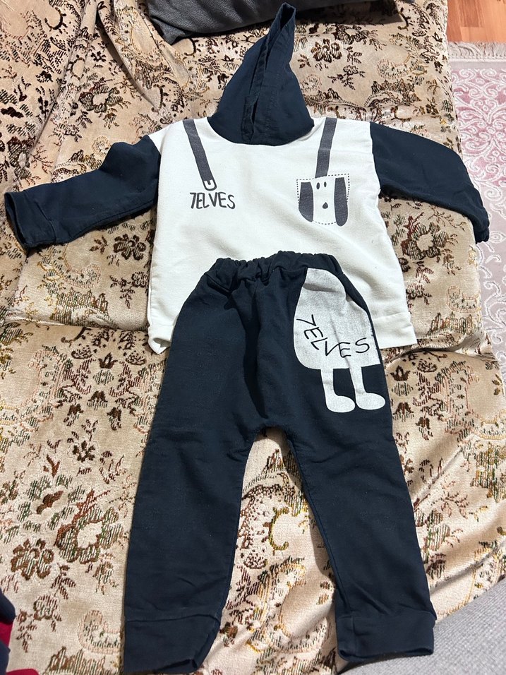 Kapüşonlu ve uzun kollu üst ile uyumlu baskılı ve örme detaylı pantolonlu bebek erkek takımı. Koyu ve beyaz renklerle sokak stilini yansıtıyor.12-18 aydır.Herhangi bir deformesi yoktur.