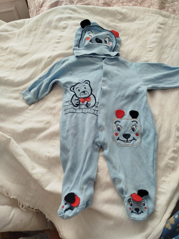Kapüşonlu ve uzun kollu, yumuşak ve sıcak kumaştan yapılmış mavi bebek tulumu. Renkli ayı desenleri ve kolay giydirme için düğmeli tasarım içerir.