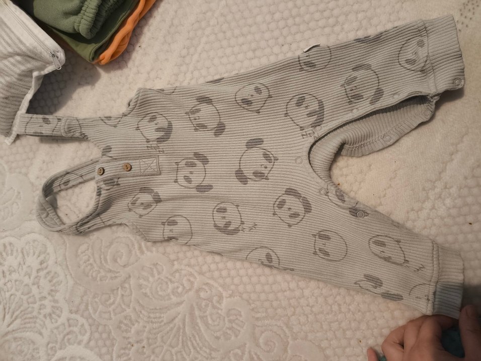 Gri renkli, kapüşonlu ve uzun kollu bebek tulumu. Örme ve yumuşak, sıcak kumaştan yapılmış, panda baskılıdır. Streetwear tarzında.