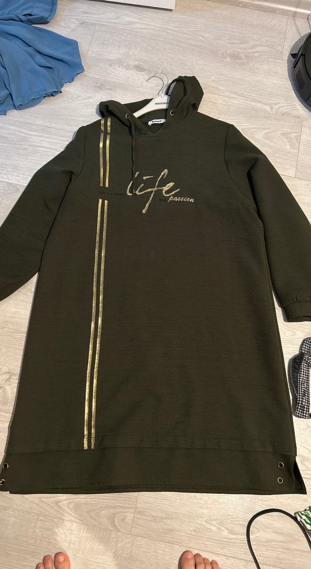 Kapüşonlu, uzun kollu, uzun kesim kadın tunik. Parlak baskılı desen, yumuşak sentetik kumaştan üretilmiştir. Trendy günlük stil için uygun.
