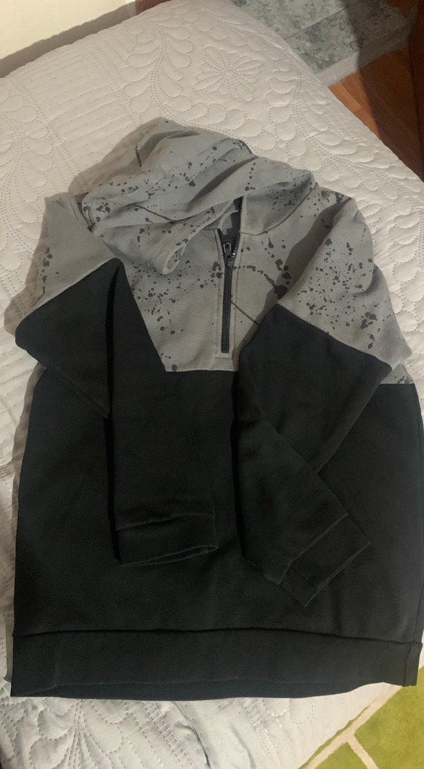 Erkek çocuklar için uzun kollu, kapüşonlu ve sweatshirt. Gri ve siyah renklerde, üst kısmında desen, sentetik kumaştan, bol kesim.