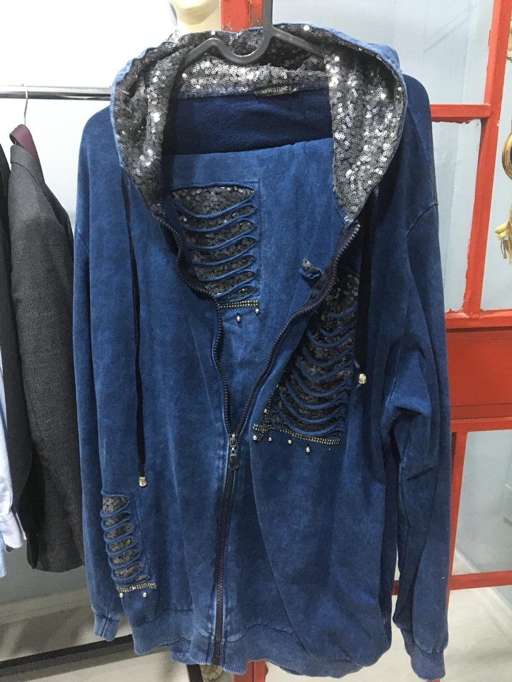 Kapüşonlu, uzun kesim mavi kot ceket, payet detaylı kapüşon ve nakışlı kesiklerle, fermuarlı ve bol kesim olarak tasarlanmıştır.