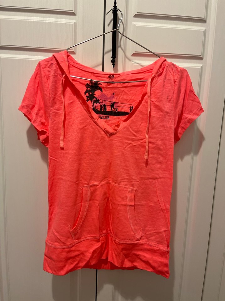 Hiç giyilmedi. Kapüşonlu, V yakalı kısa kollu, bol kesim kadın tişörtü. Yumuşak keten kumaştan ve baskılı desene sahip, ön cepli, rahat sokak stili için ideal.