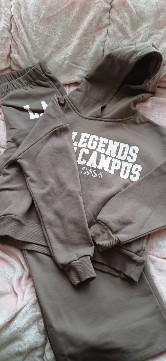 Gri kapüşonlu sweatshirt ve eşofman altı takımı, bol kesim ve 'LEGENDS CAMPUS 2004' baskılıdır. Yumuşak, sıcak kumaştan, uzun kollu ve bisiklet yaka tasarımlıdır. Rahat ve şık sokak stili sunar. ️